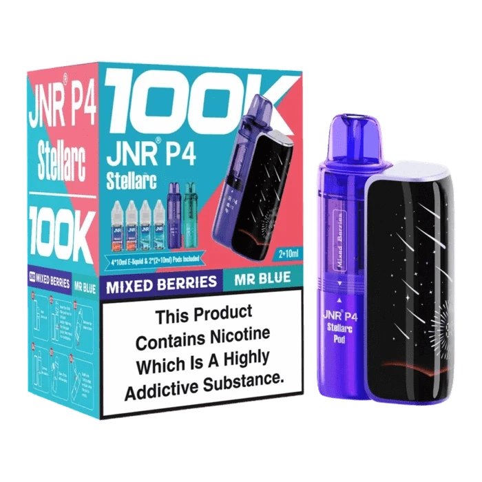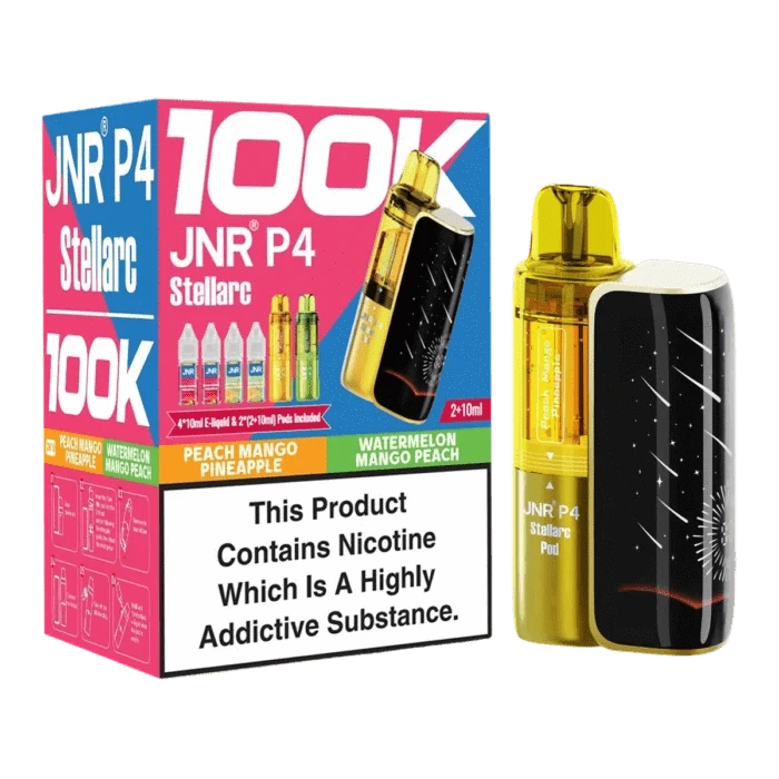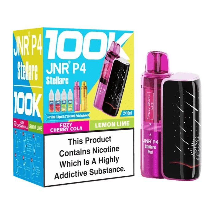The JNR P4 Stellarc 100K, a big puff legal vaping with the UK’s first ban-proof 100,000 puff JNR Prefilled Pod Vape Kit. Built with a smart auto-feed pod system, each 2ml pod is linked to a 10ml refill container, automatically collecting e-liquid as you vape. Designed with a curved animated LED screen, dual mesh coil technology, and a durable design with vibrant colours.